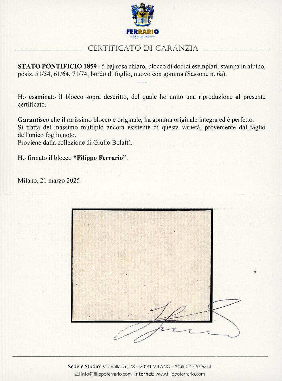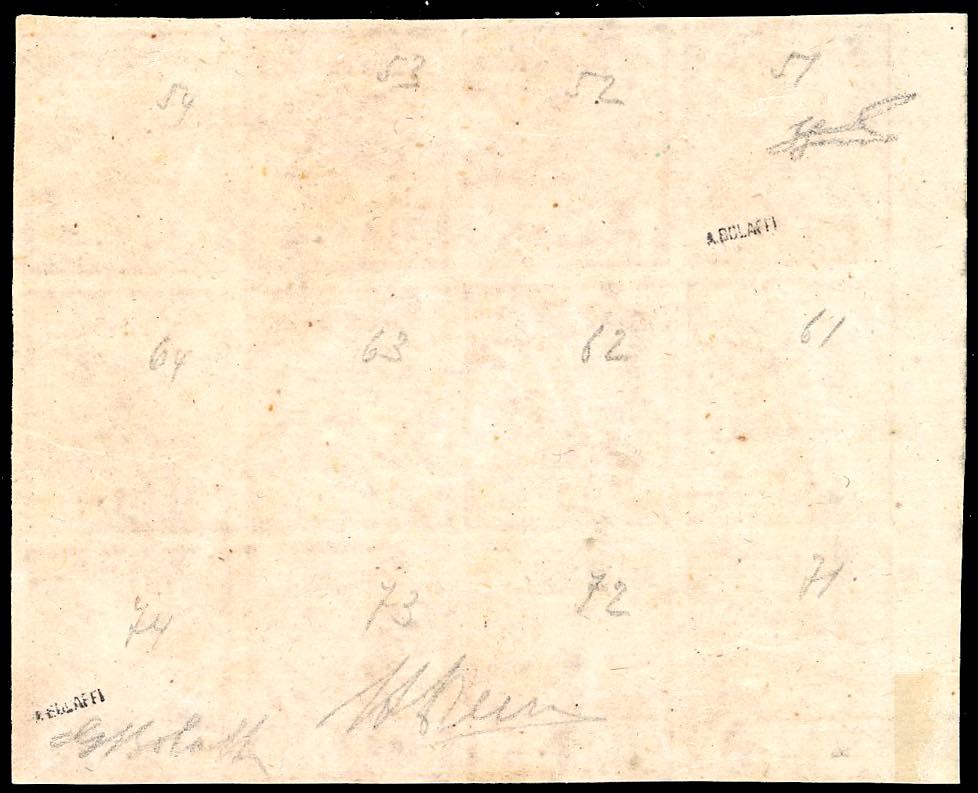 1852 - 5 baj rosa chiaro, stampa in albino (6a), blocco di 12 esemplari, posiz. 51/54, 61/64, 71/74, bordo di foglio, nuovo, gomma originale integra, perfetto. Si tratta del MASSIMO MULTIPLO ANCORA ESISTENTE di questa classica varietà, proveniente dal taglio dell'unico foglio noto. G.Bolaffi, A.Diena, cert. Ferrario.