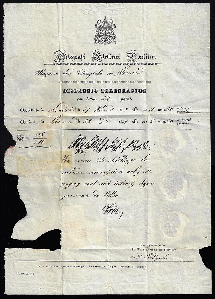1858 - Modulo di telegramma da Londra 27/12/1858, ricevuto a Roma il giorno seguente e spedito previa affrancatura con 5 baj rosa carminio e 8 baj bianco, coppia (6A,9), perfetti, a Napoli, bollo dell' "Ufficio telegrafico di Roma" sul fronte, e "Roma Franca". Dei pochissimi dispacci telegrafici dello Stato Pontificio affrancati noti, questo è l' UNICO indirizzato in uno Stato estero. Grande rarità storico postale, da esposizione. Ex coll. Imperato. Cert. Ferrario.