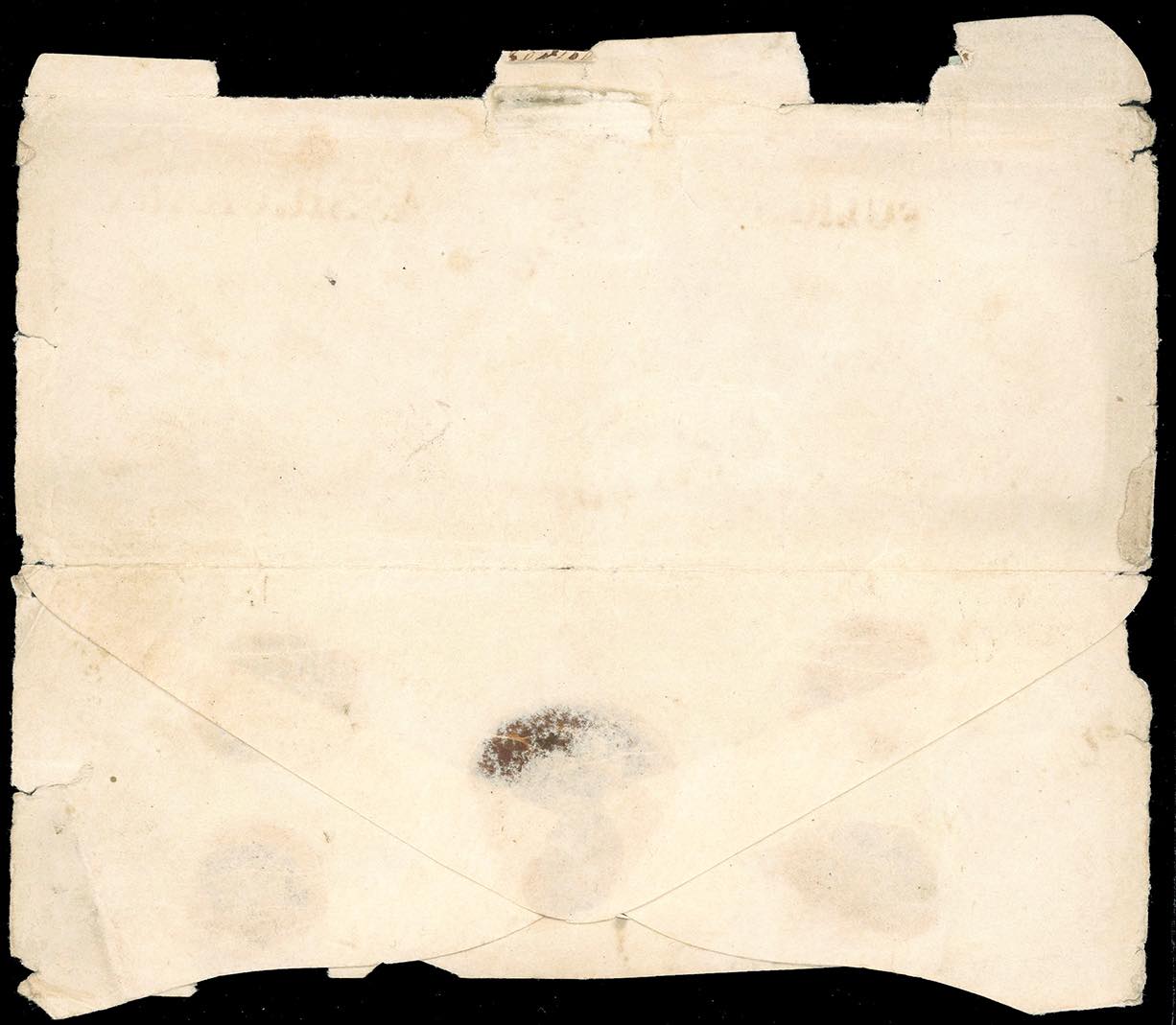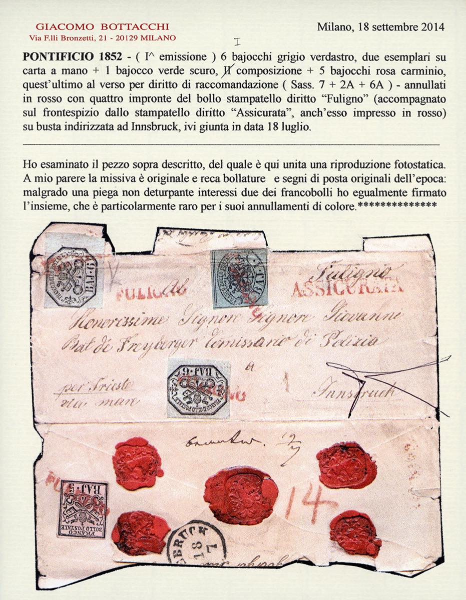 1852 - 6 baj grigio verdastro, due esemplari, 1 baj verde scuro, I composizione, e, al verso per il diritto di raccomandazione, 5 baj rosa carminio (7,2A,6A), su busta assicurata da Foligno, lineare rosso annullatore (punti R3), a Innsbruck 18/7, in Austria. Malgrado due francobolli siano interessati da una piega non deturpante, si tratta di un insieme unico, molto coreografico e di grandissima rarità. Cert. Bottacchi (cat.Sassone € 35.000/52.500++).