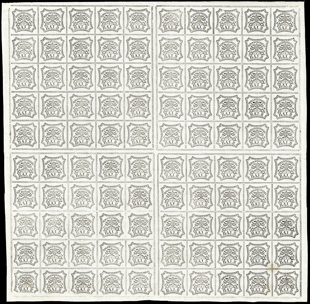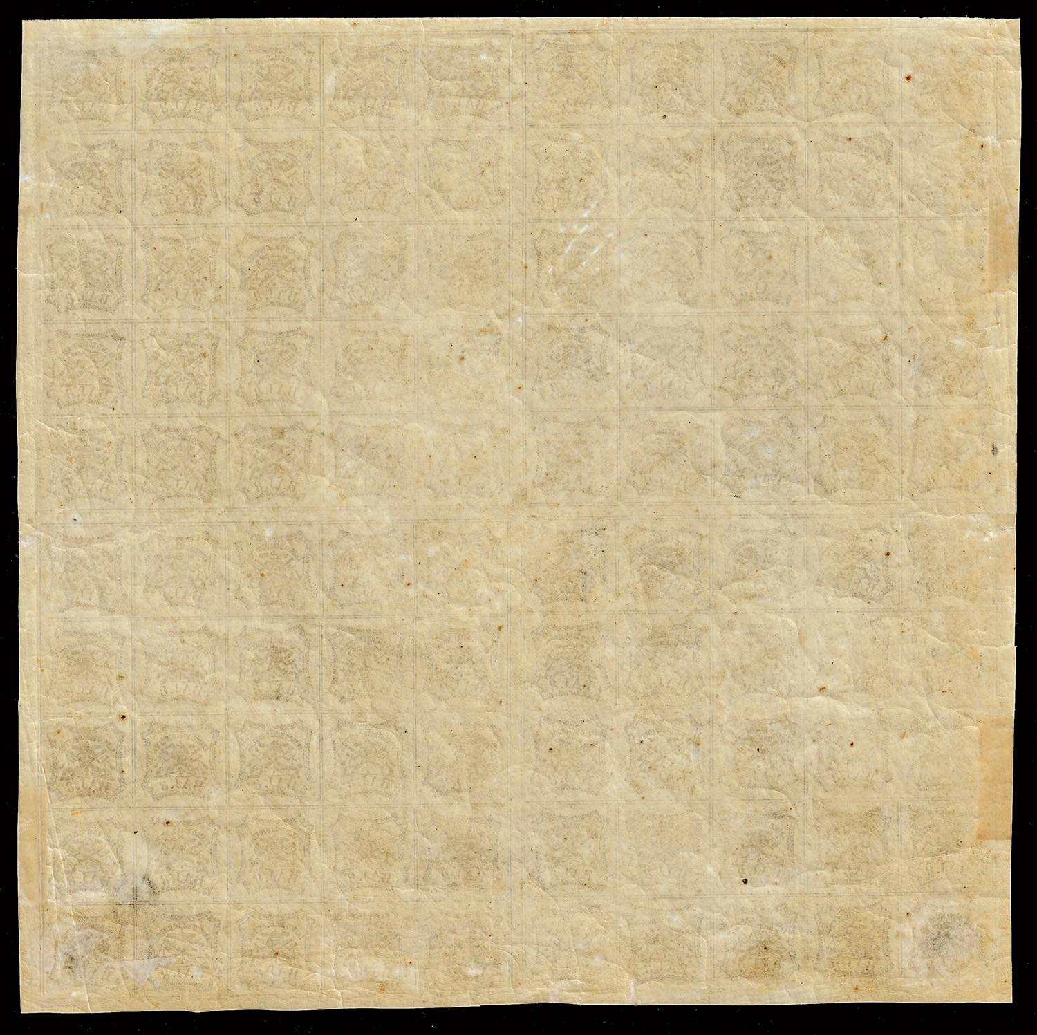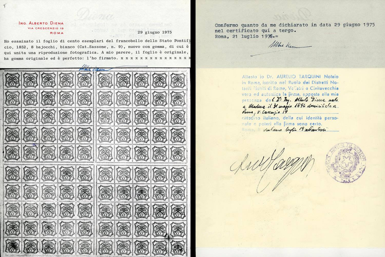 1852 - 8 baj bianco (9), foglio completo di 100 esemplari con interspazio di gruppo, nuovo, gomma originale integra, solo pochi esemplari di margine con linguella, perfetto. Molto raro. Cert. Alberto Diena.