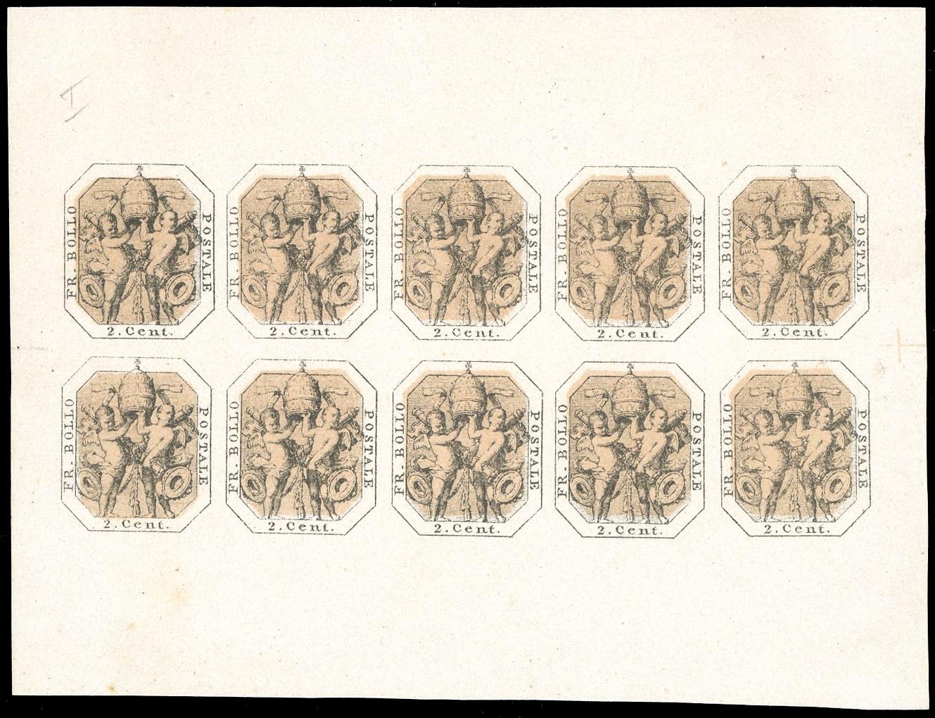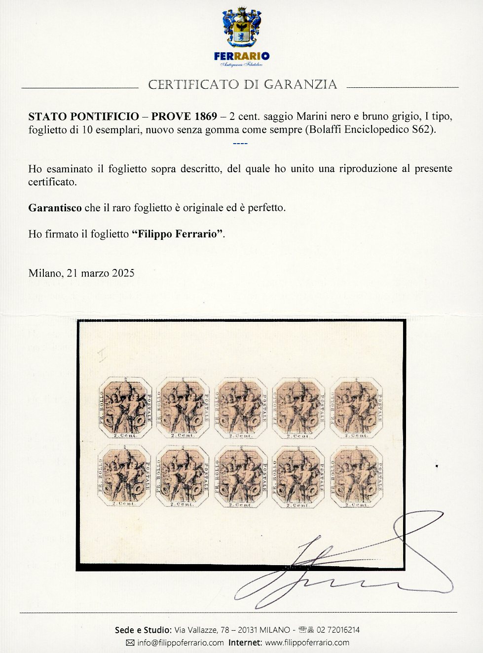1869 - 2 cent. saggio Marini nero e bruno grigio, I tipo (Bolaffi Enciclopedico S62), foglietto di 10 esemplari, nuovo senza gomma come sempre, perfetto. Molto raro e di splendida qualità. Cert. Ferrario.