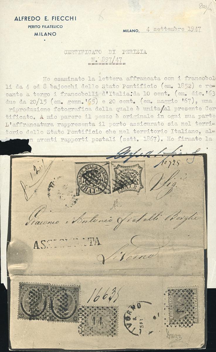 1867 - 4 baj giallo chiaro, 8 baj bianco (5Ab,9), in affrancatura mista con 10 cent. De La Rue, tiratura di Torino, 20 cent. su 15 cent. Ferro di cavallo, I tipo, due esemplari, 20 cent. celeste, tiratura di Londra, del Regno d'Italia applicati al verso (T17,23,L26), tutti i francobolli perfetti, su busta assicurata di doppio porto da Roma 5/9/1867 a Livorno. Affrancatura mista di eccezionale impatto visivo e di rarità assoluta: una delle due sole affrancature miste "assicurate" note con i bajocchi; unica affrancatura mista PENTACOLORE nota, impreziosita dall'abbinamento di valori gemelli Ferro di cavallo - Bigola. INSIEME UNICO DA ESPOSIZIONE. A.Diena, cert. Fiecchi, cert. Ferrario.