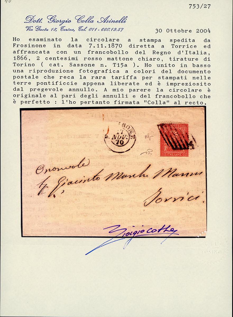 1870 - 2 cent. De La Rue, tiratura di Torino (T15a), perfetto, isolato su circolare a stampa da Frosinone 7/11/1870 a Torrice. Rara tariffa in questo periodo. Vaccari, Raybaudi, cert. Colla.