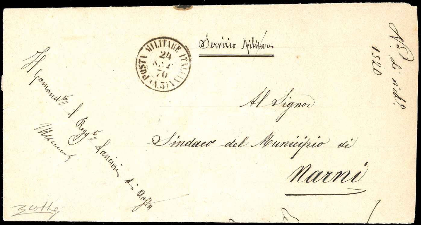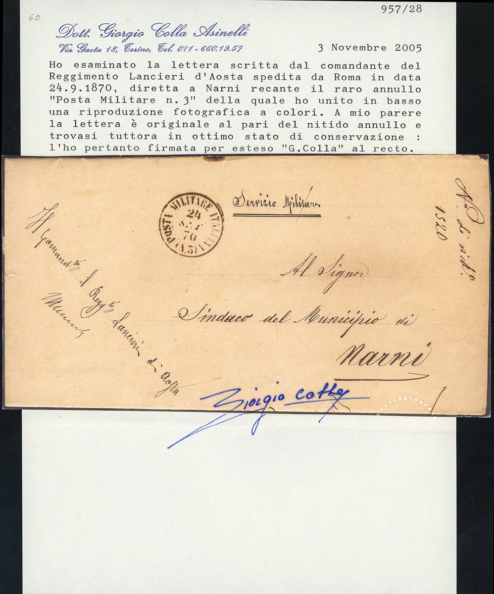 1870 - Lettera in franchigia scritta a Roma 23/9/1870 dal Comandante del Reggimento Lancieri d'Aosta spedita dall'ufficio di Posta Militare n. 3 il 24/7/1870 per Narni. Estremamente rara. Cert. Colla.