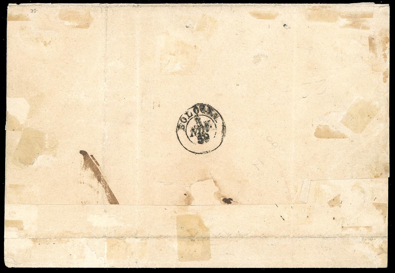 1859 - 6 baj verde giallo (7), perfetto e ben marginato, su lettera di doppio porto da Forlì 4/11/1859 a Bologna. Una delle due sole lettere note affrancate con il raro 6 baj inviate da Forlì. Rarità del Governo Provvisorio delle Romagne. Alberto Diena, Colla, Raybaudi, cert. Enzo Diena e Ferrario. Ex coll. Barcella.