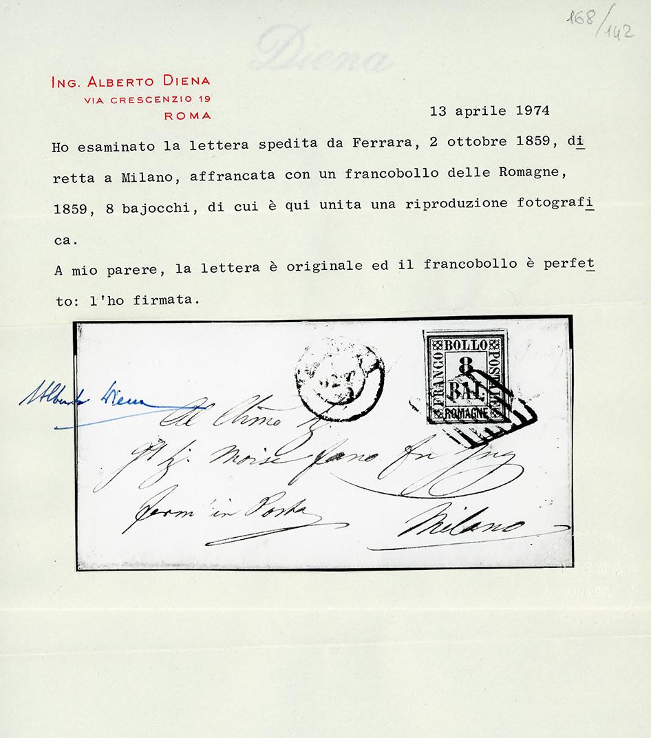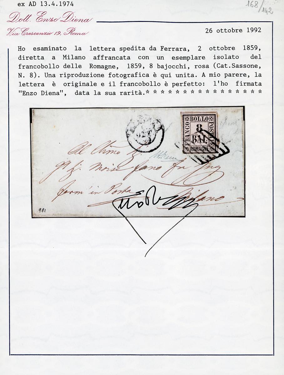1859 - 8 baj rosa (8), perfetto, su sovracoperta di lettera da Ferrara 2/10/1859 a Milano, bollo d'arrivo. Em.Diena, cert. A. ed E.Diena.