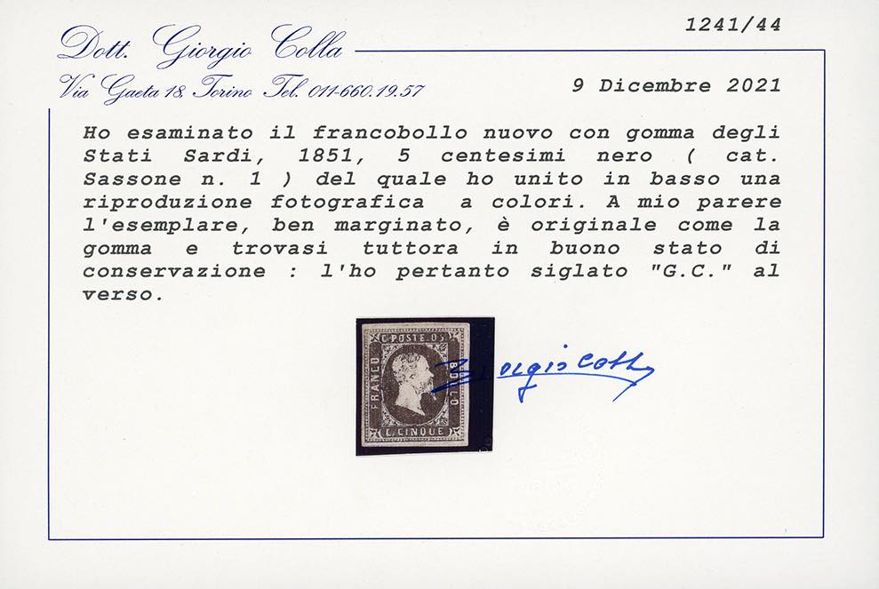 1851 - 5 cent. nero (1), nuovo, gomma originale, buono stato. Ottimo aspetto. Sorani, cert. Colla.
