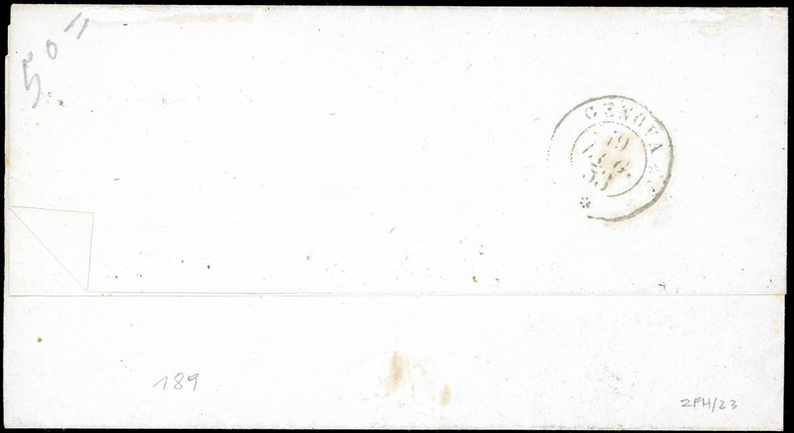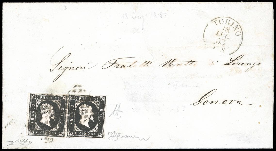 1853 - 5 cent. nero intenso (1b), coppia orizzontale, perfetta, su circolare da Torino 18/7/1853 a Genova. Rara e di bellissima qualità. Grioni, cert. A.Diena e Colla.
