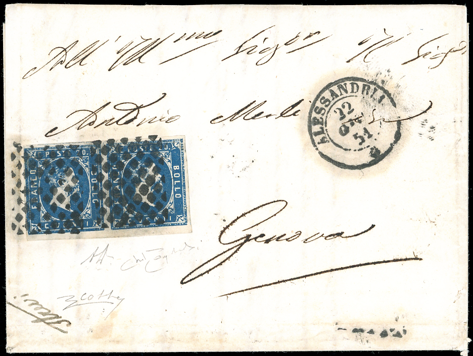 1851 - 20 cent. azzurro scuro, I tiratura (2c), coppia orizzontale, bordo di foglio in basso, perfetta, su lettera da Alessandria ... Leggi tutto