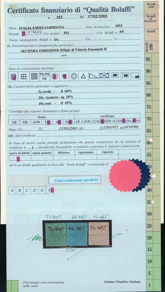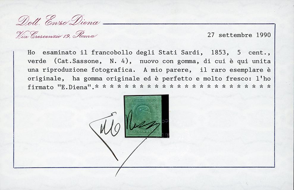 1853 - 5 cent. verde (4), nuovo, gomma originale, perfetto e molto fresco. Splendido, ottima qualità. Emilio ed Alberto Diena, cert. E.Diena e Finanziario Bolaffi.