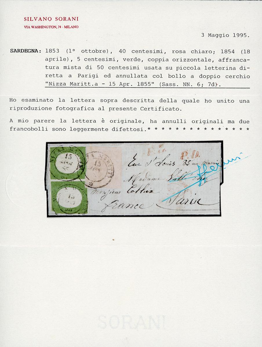 1855 - 40 cent. rosa chiaro, perfetto e ben marginato, 5 cent. verde, coppia, un esemplare difettoso (6,7), su graziosa lettera di formato mignon da Nizza Marittima 15/4/1855 a Parigi. Rara affrancatura mista con seconda e terza emissione, di ottimo aspetto. Cert. Sorani.