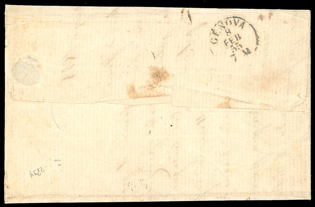 1855 - 5 cent. verde (7), quattro esemplari, due perfetti, due con margini sfiorati, su fresca lettera da Torino 7/2/1855 a Genova. Rara affrancatura multipla monovalore. Ferrario, cert. A.Diena. Ex coll. Imperato.