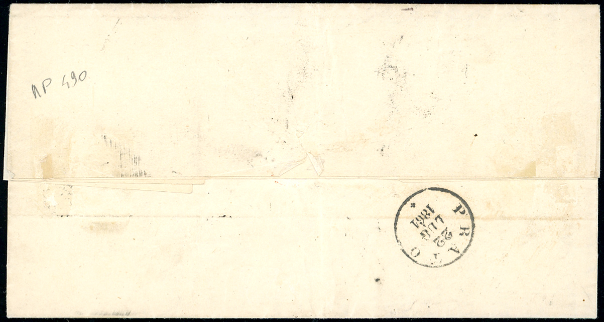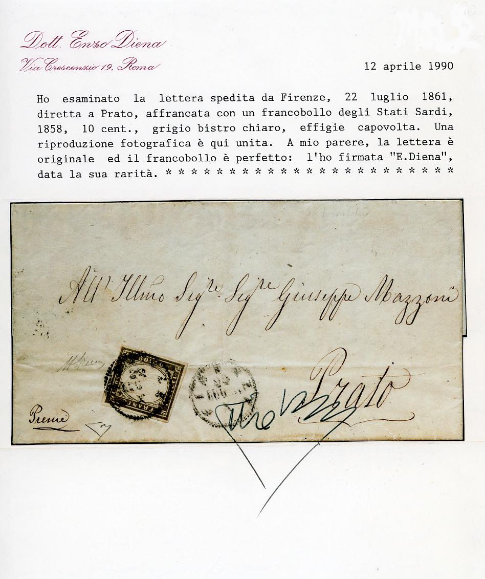 1861 - 10 cent. grigio bistro chiaro, EFFIGIE CAPOVOLTA (14Cc), ottimo stato, su lettera da Firenze 22/7/1861 a Prato. Rarissima e molto fresca! Diena, cert. E.Diena.