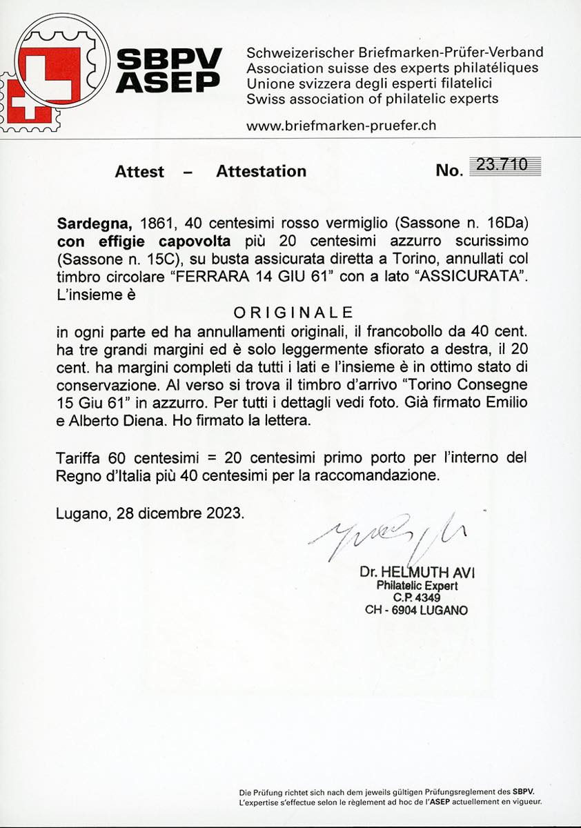 1861 - 40 cent. rosso vermiglio, EFFIGIE CAPOVOLTA, leggermente intaccato a destra, 20 cent. azzurro scurissimo, perfetto (16Da,15C), su busta assicurata da Ferrara 14/6/1861 a Torino. Molto rara e di ottimo aspetto. Em. e A.Diena, cert. Avi.