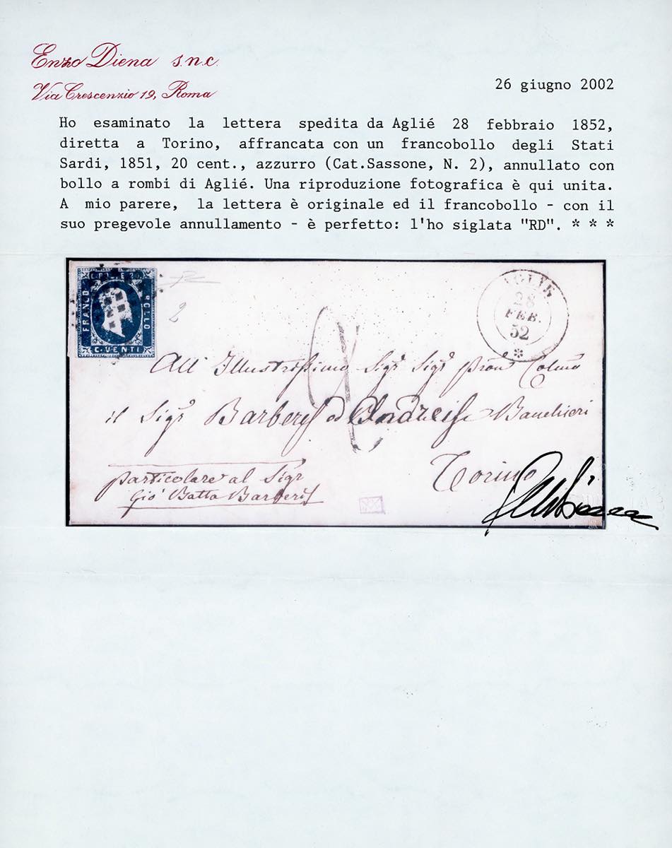 PIEMONTE-AGLIE', punti R1 - 20 cent. (2), perfetto, su lettera del 28/2/1852 per Torino, tassata. Molto rara! Raybaudi, cert. Diena.
