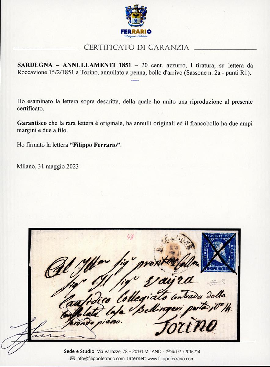 PIEMONTE-ROCCAVIONE a penna, doppio cerchio D, punti R1 - 20 cent. azzurro, I tiratura (2a), due ampi margini, due a filo, perfetto e molto fresco, su lettera del 15/2/1851 a Torino, bollo d'arrivo. Bellissima e molto rara. Cert. Ferrario.