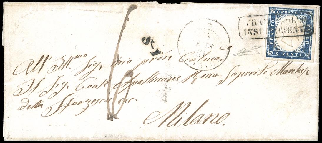 PIEMONTE-TORINO, francobollo insufficiente - 20 cent. (15Ab), perfetto, su lettera insufficientemente affrancata del 13/9/1857 a Milano, bollo S.1 e segno di tassa 6. Il francobollo venne annullato con il solo bollo in cartella "francobollo insufficiente". Molto raro e non catalogato. Ferrario.