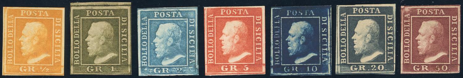 1859 - L'emissione tipo, sette valori, tavole e carte più comuni (2,5,6,11/14), gomma originale, integra per i n. 2 e 6, perfetti. Molto belli! Cert. Finanziario Bolaffi 70%.