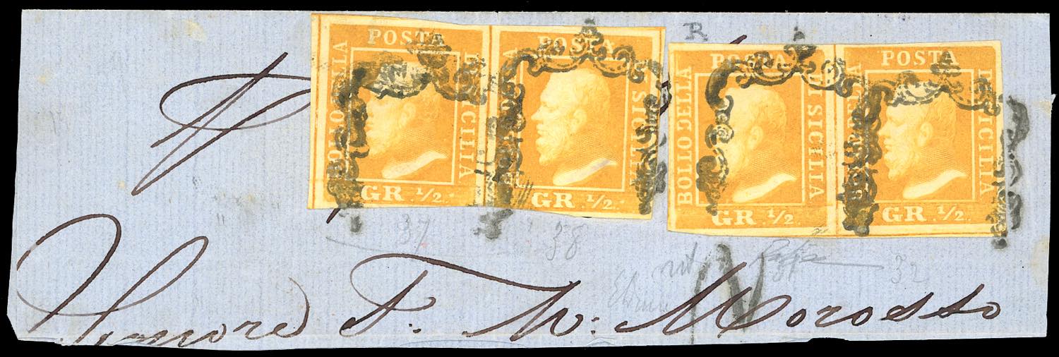 1859 - 1/2 grano arancio, I tavola carta di Napoli (1a), due coppie orizzontali, una pos. 31 (con ritocco) e 32, perfetta, l'altra pos. 37-38, leggermente intaccata in basso, usate su ampio frammento di lettera. Raro insieme, di ottimo aspetto. Em. e R.Diena.