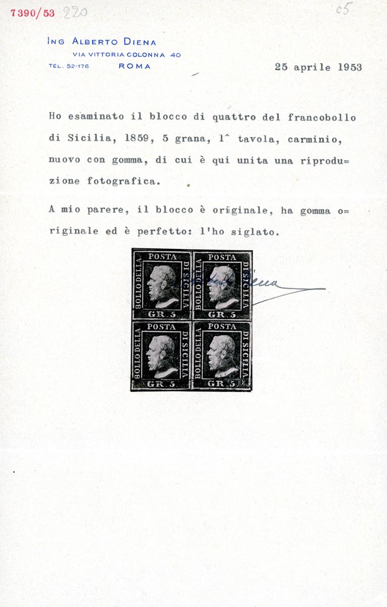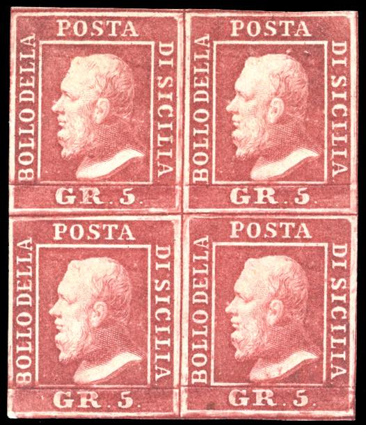 1859 - 5 grana carminio, I tavola (9a), blocco di quattro, gomma originale, perfetto e ben marginato. Molto fresco. Colla, Raybaudi, ... Leggi tutto