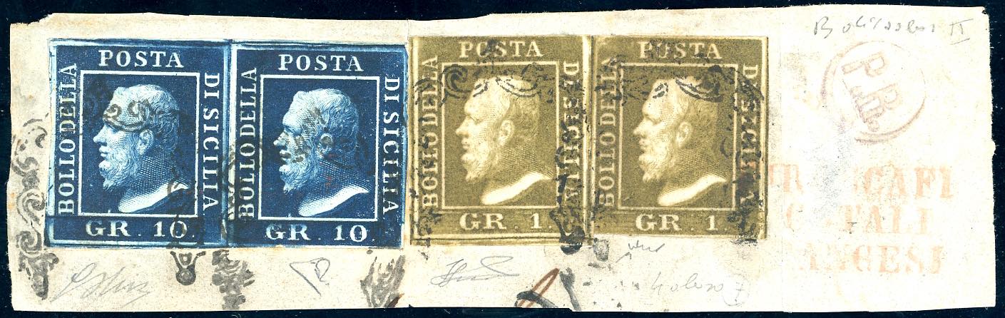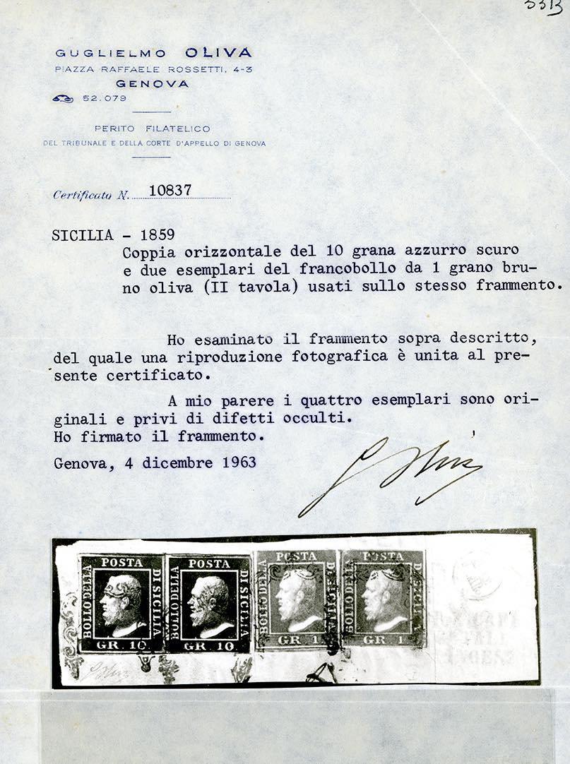1859 - 1 grano bruno oliva, II tavola, stampa oleosa, due esemplari, 10 grana azzurro cupo, coppia (4b,12), perfetti, usati su frammento. Insieme probabilmente unico, di grande rarità per la presenza di due esemplari da 1 grano oleosi. Chiavarello, cert. E.Diena, Oliva e Ferrario. Ex coll. Imperato.