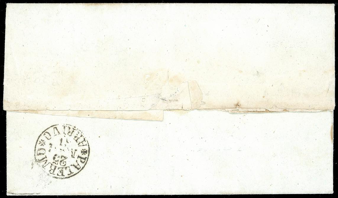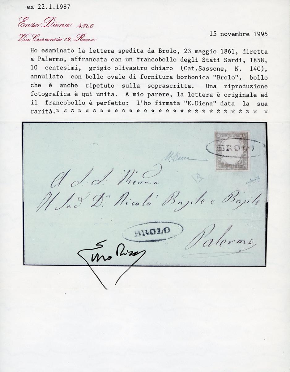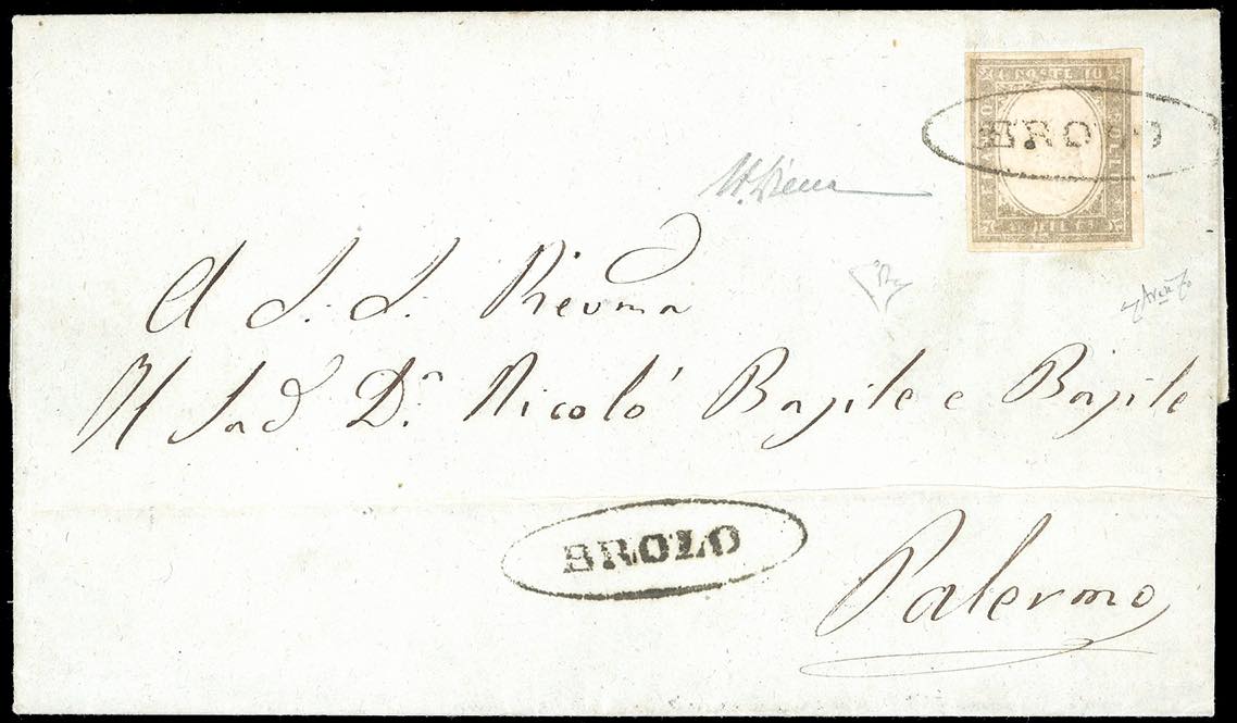 BROLO, ovale punti R1 - 10 cent. grigio olivastro chiaro IV emissione di Sardegna (14C), perfetto, su fresca lettera del 23/5/1861 per Palermo. Rara e di qualità eccezionale. G.Avanzo, A.Diena, cert. E.Diena.