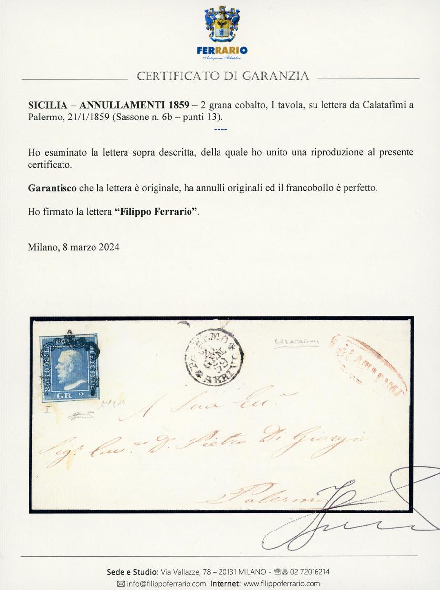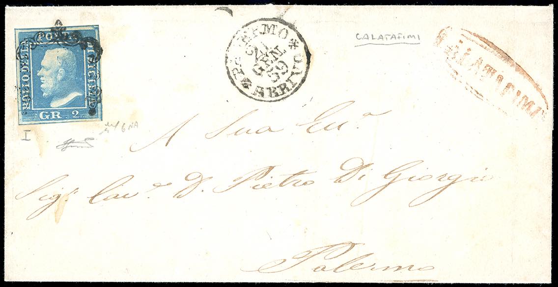 CALATAFIMI, punti 13 - 2 grana (6b), perfetto e ben marginato, su lettera per Palermo 21/1/1859. Chiavarello, cert. Ferrario. Ex coll. Imperato.