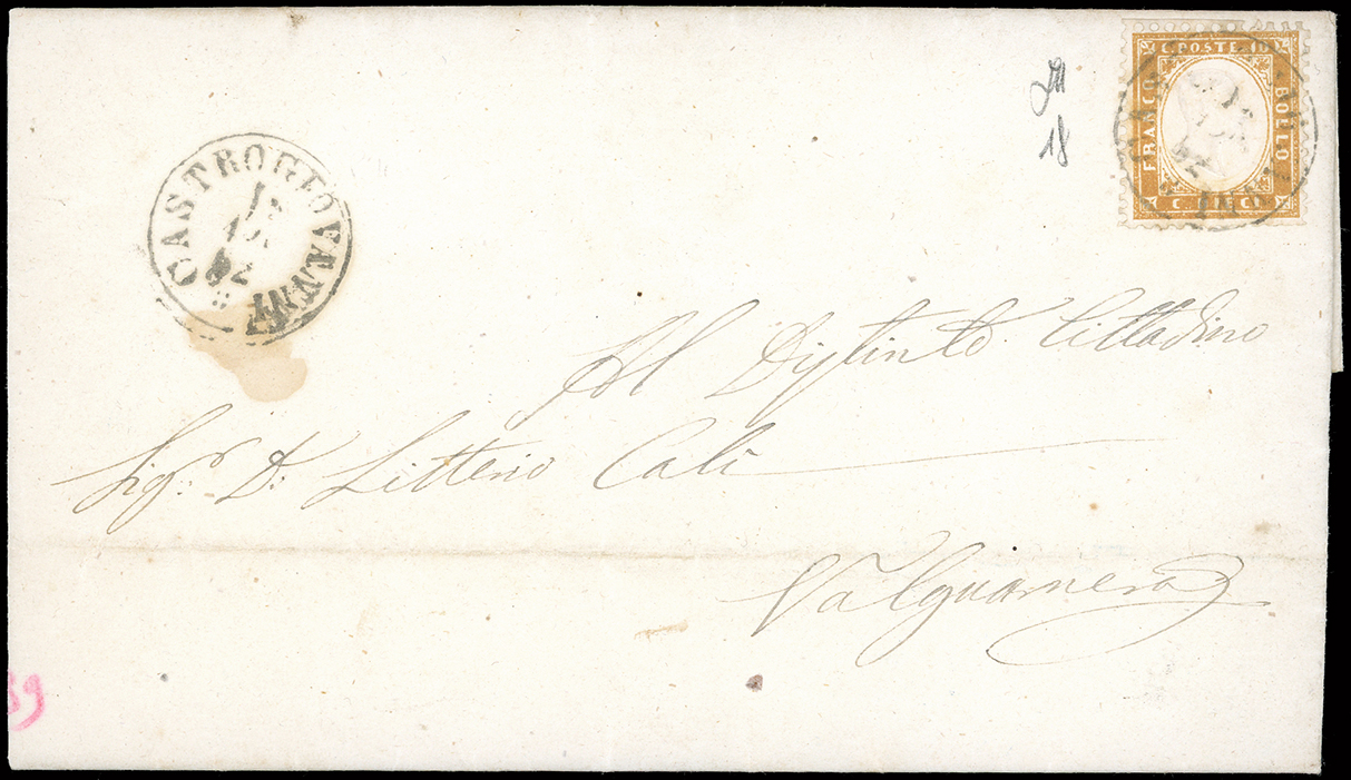 CASTROGIOVANNI, sardo italiano punti 12 - 10 cent. (Regno 1), separato in basso con le forbici, ottimo stato, su fresca lettera del 16/11/1862 a Valguarnera. Raro annullo.