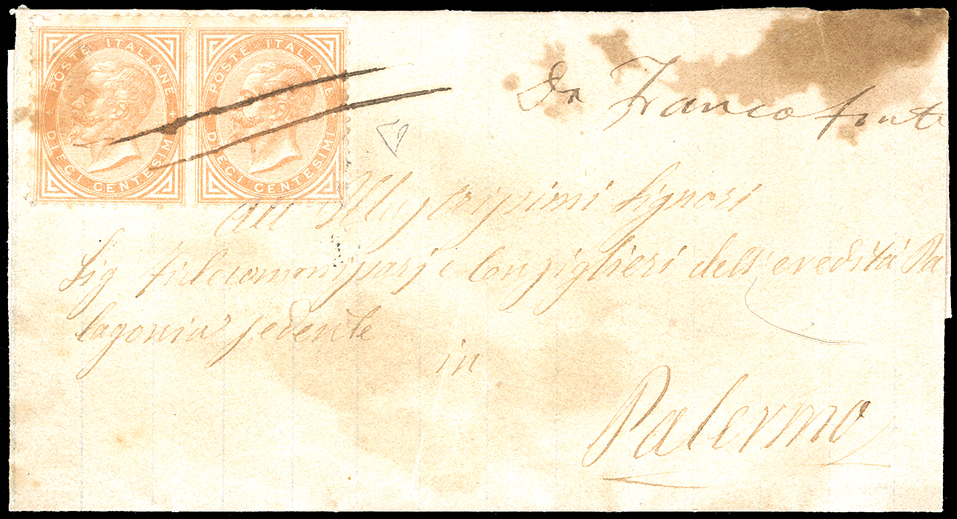 FRANCOFONTE, a penna inedito - 10 cent. De La Rue (T17), coppia, difetti, su lettera da Palermo, al verso il datario a cerchio di Lentini. Interessante e rara, per specialista. Cert. E.Diena.