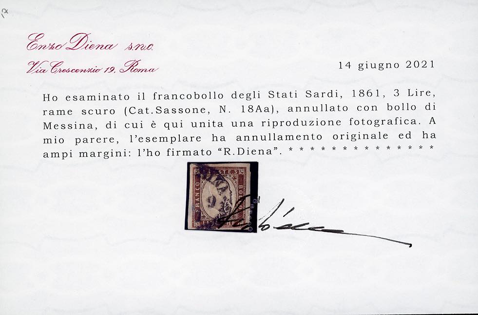 MESSINA, cerchio con ornato di palme - 3 lire rame scuro, IV emissione di Sardegna (18Aa), perfetto e ben marginato, usato con il bollo ... Leggi tutto