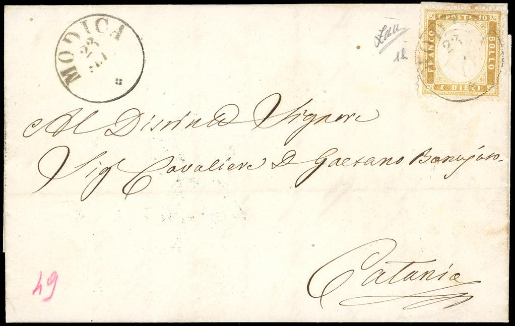 MODICA, sardo italiano punti 12 - 10 cent. (Regno 1), perfetto, su lettera del 23/9/1862 per Catania. Raro annullo, ottima qualità.