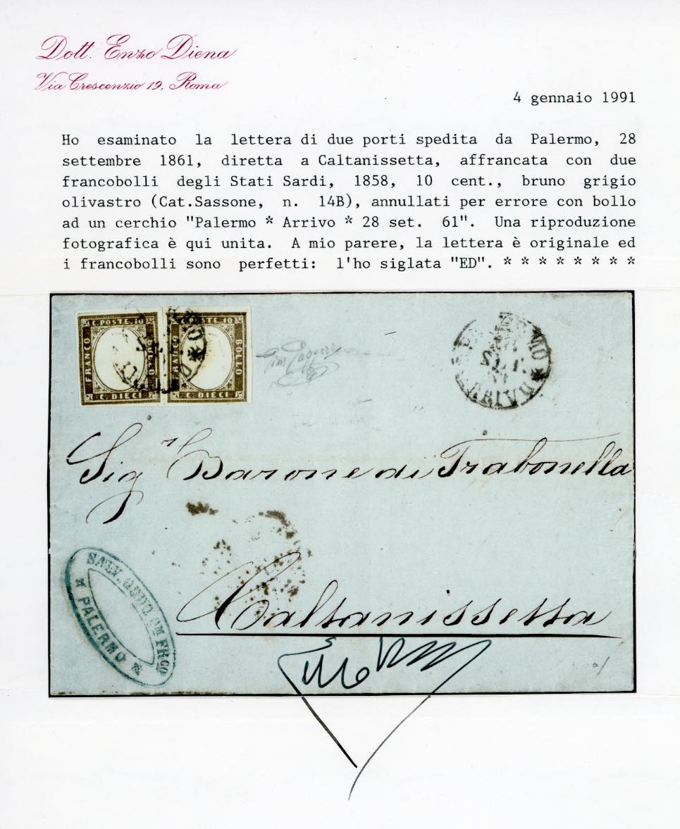 PALERMO ARRIVO, borbonico, punti 12 - 10 cent. bruno grigio olivastro (14B), due esemplari perfetti, su fresca lettera del 28/9/1861 per Caltanissetta. Bella e non comune. Raybaudi, Gaggero. Cert. E.Diena.