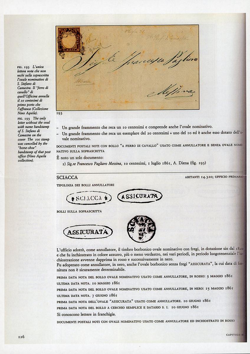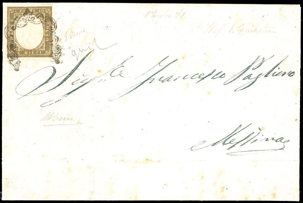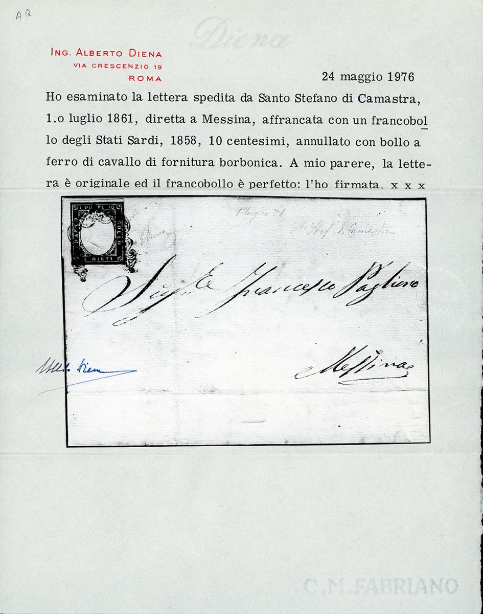 S.STEFANO DI CAMASTRA, ferro di cavallo senza ovale sulla soprascritta punti R3 - 10 cent. bruno grigio olivastro, IV emissione di Sardegna (14Cg), perfetto, su lettera del 1/7/1861 per Messina. Si tratta dell'UNICA LETTERA NOTA SENZA L'OVALE DI PARTENZA sul fronte. Rarità del settore, per specialista. Emilio Diena, Aquila, cert. Alberto Diena. Ex coll. Aquila, riprodotta a pag. 126 della sua monografia "La Posta fra due Re"(cat.Sassone € 35.000/52.500).