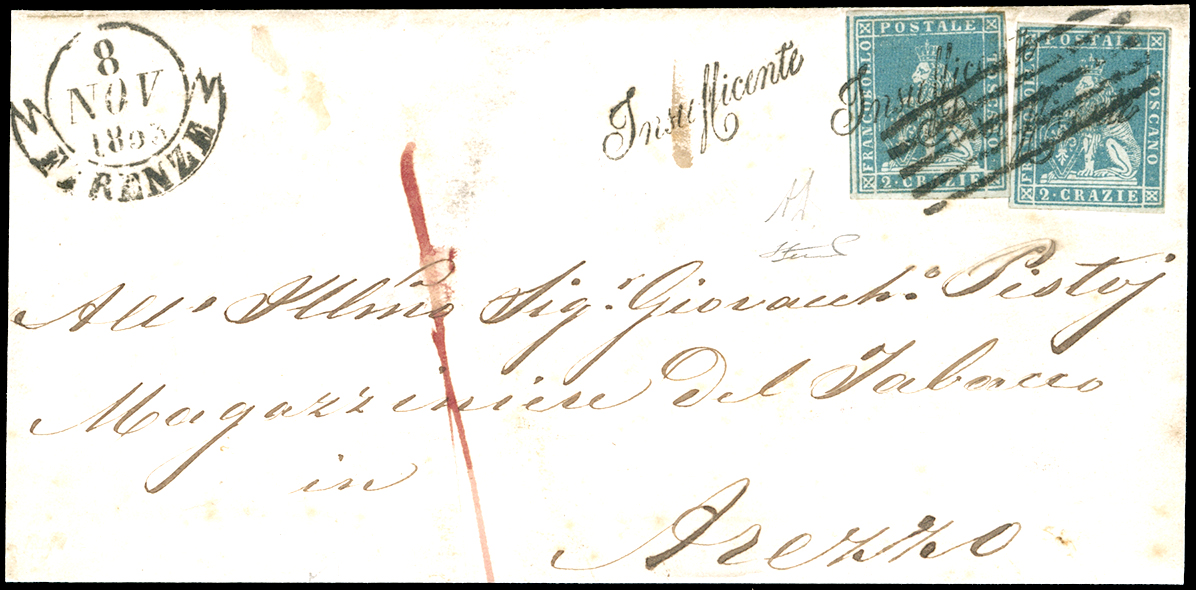1853 - 2 crazie azzurro su grigio (5), due esemplari, perfetti, su lettera da Firenze 8/11/1853 ad Arezzo, tassata. I due francobolli sono annullati del bollo a 5 sbarre ed il corsivo "Insufficiente". Molto bella e non comune. A.Diena, Ferrario.