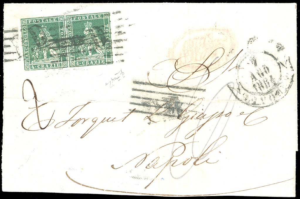 1854 - 4 crazie verde su grigio (6), coppia, ottimo stato, su sovracoperta di lettera da Livorno 7/8/1854, via di terra, bollo di transito per lo Stato Pontificio al verso, tassata 10 grana. Sul fronte il bollo P.D. di Livorno è stato cassato con il muto a cinque sbarre ripetuto anche sulla coppia. Interessante. Dettagliato cert. Avanzo.