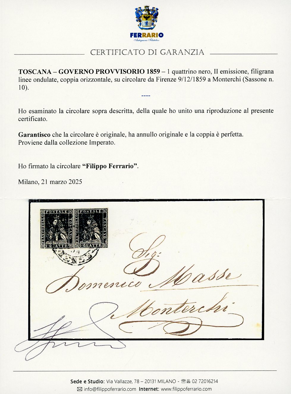 1859 - 1 quattrino nero, II emissione (10), coppia perfetta, su circolare da Firenze 9/12/1859 a Monterchi. Chiavarello, cert. Ferrario. Ex coll. Imperato.
