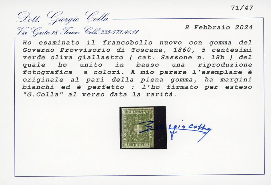 1860 - 5 cent. verde oliva giallastro (18b), gomma originale, leggera traccia di linguella, perfetto e ben marginato. Raro e di ottima qualità. G.Oliva, A.Diena, cert. Colla.