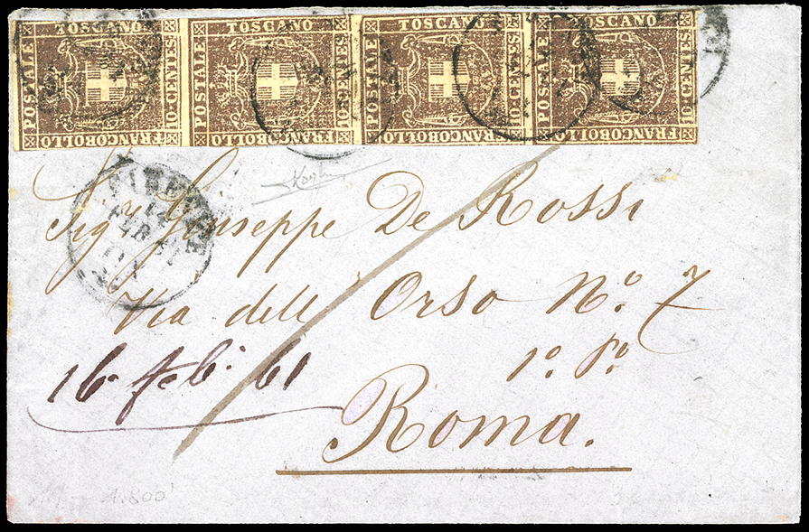 1861 - 10 cent. bruno (19), striscia verticale di quattro, margini laterali intaccati, su busta da Firenze 14/2/1861 a Roma. Raro multiplo. Cert. Raybaudi.