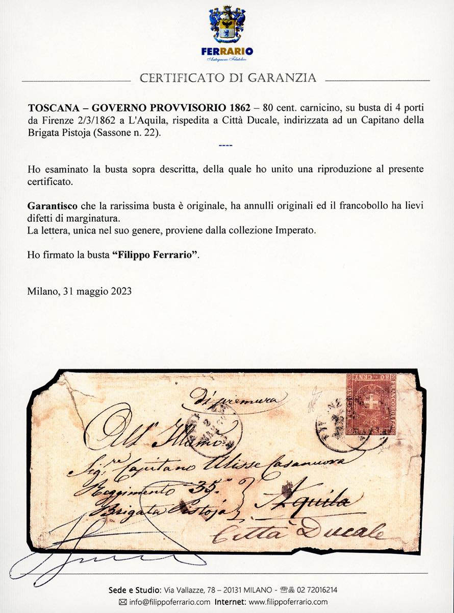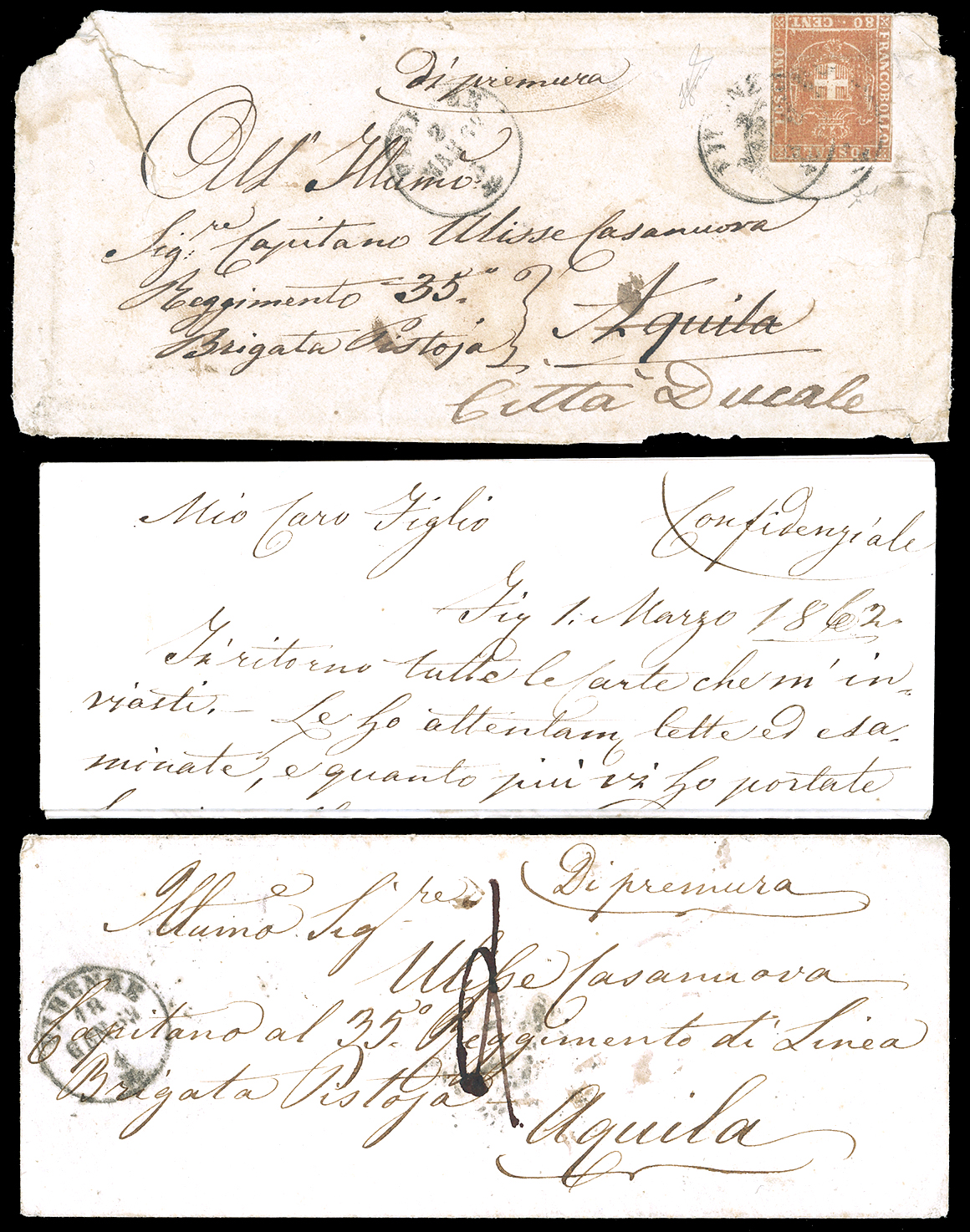 1862 - 80 cent. carnicino (22), difetti, su busta di 4 porti da Firenze 2/3/1862 a L'Aquila, rispedita a Città Ducale, indirizzata ad un Capitano della Brigata Pistoja, allegato il testo interno. Unita una busta dello stesso archivio spedita non affrancata da Firenze 18/1/1862 a L'Aquila. Rarissimo porto multiplo per l'interno, UNICA FINORA NOTA. Chiavarello per la lettera affrancata e cert. Ferrario. Ex coll. Imperato.