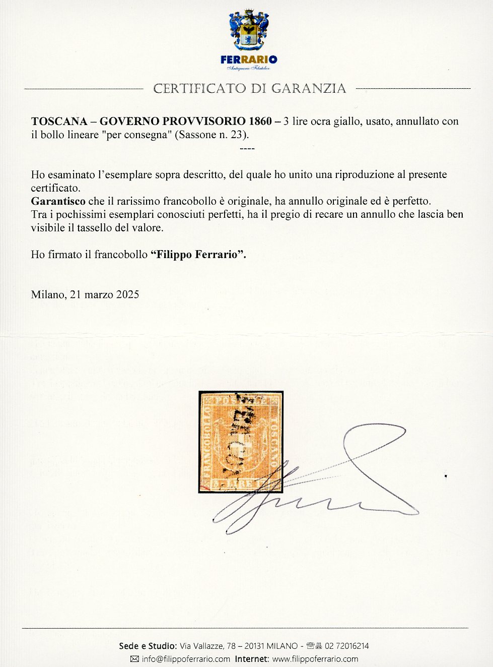 1860 - 3 lire ocra giallo (23), usato, perfetto, annullato con il lineare "per consegna", che lascia l'indicazione del valore ben visibile. Gli esemplari usati del 3 lire senza difetti sono meno di trenta. Ottimo esemplare di questo rarissimo francobollo. Emilio Diena, cert. Enzo Diena, Manzoni e Ferrario.