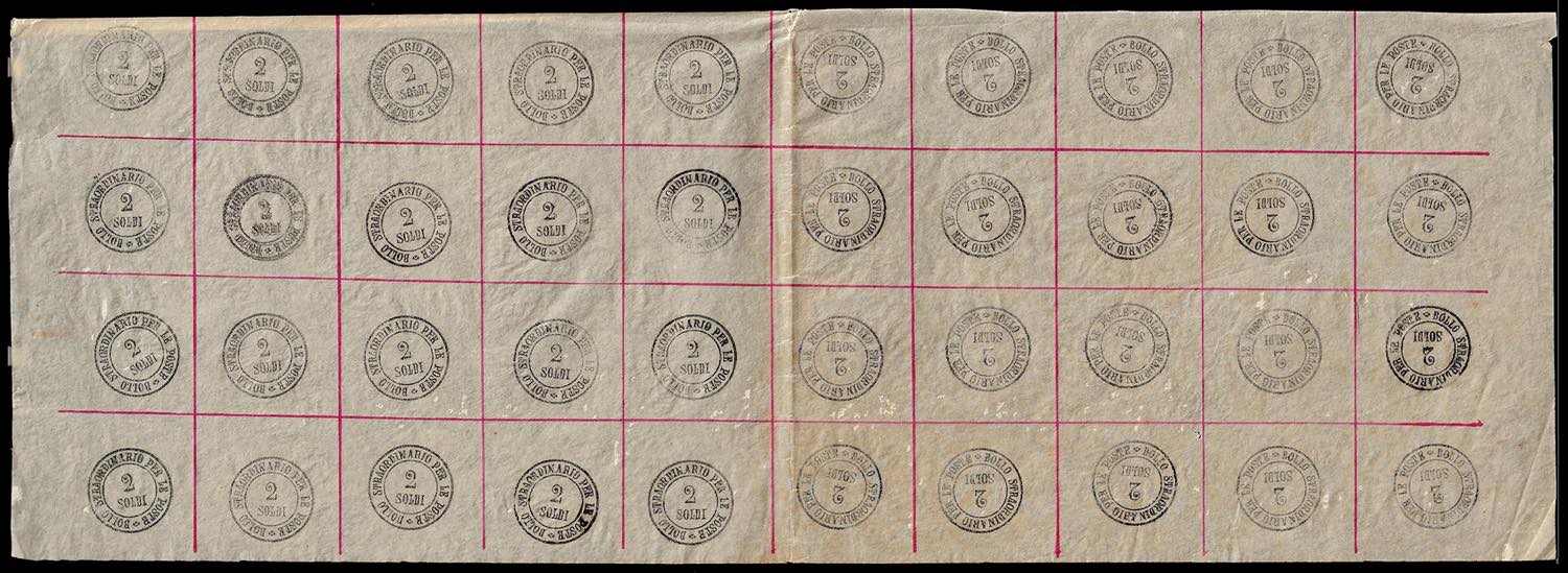 1854 - 2 soldi nero, segnatasse per giornali (1), mezzo foglio di 40 esemplari con quattro coppie téte-béche, nuovo, senza gomma, ... Leggi tutto