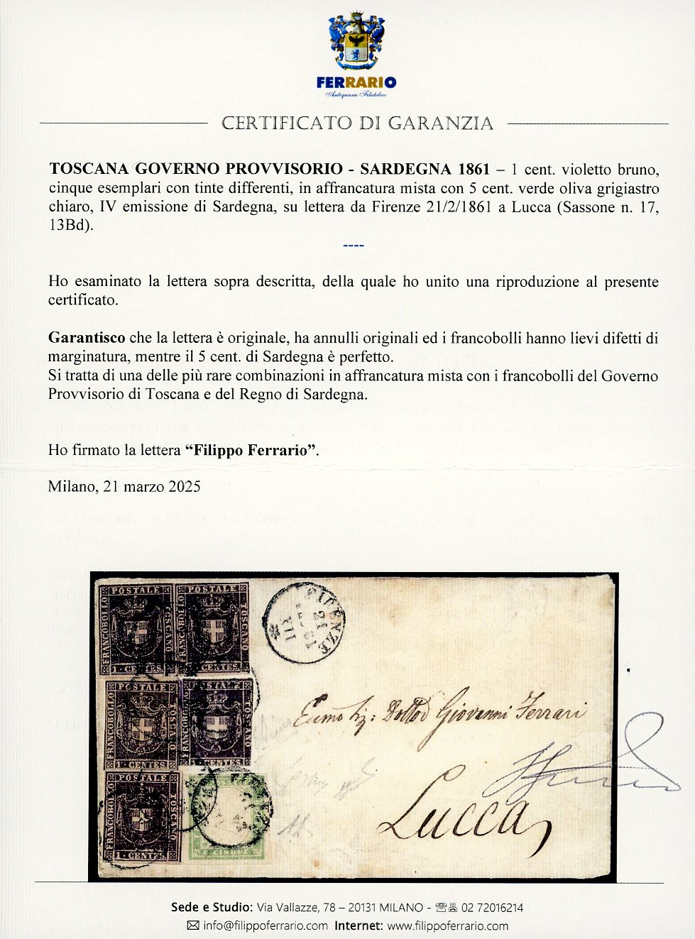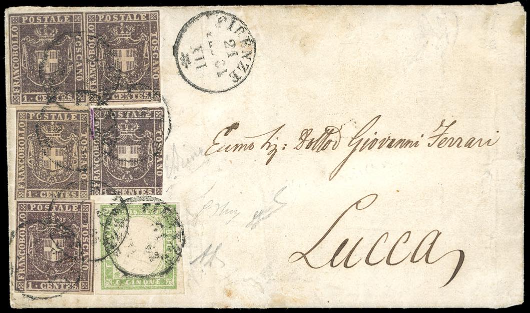 1861 - 1 cent. violetto bruno (17), cinque esemplari di tinte differenti, difetti di marginatura, in affrancatura mista con 5 cent. verde oliva grigiastro chiaro, IV emissione di Sardegna (13Bd), perfetto e con grandi margini , su lettera da Firenze 21/2/1861 a Lucca. Si tratta certamente di una delle più rare combinazioni in affrancatura mista con i francoblli del Governo Provvisorio di Toscana. INSIEME UNICO!