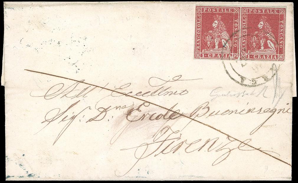 BARGA, doppio cerchio punti 11 - 2 crazie (4), coppia perfetta, su lettera del 26/12/1855 per Firenze. Molto bella, con evidente varietà ... Leggi tutto