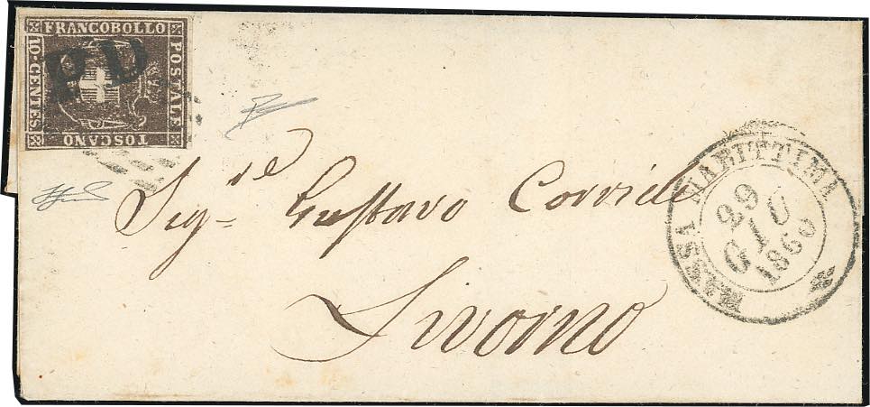 MASSA MARITTIMA, muto a rombi + PD combinazione inedita - 10 cent. (19), corto a destra, su sovracoperta di lettera del 29/6/1860 per Livorno. Interessante combinazione di coannullatori non catalogata. R.Diena, Ferrario.