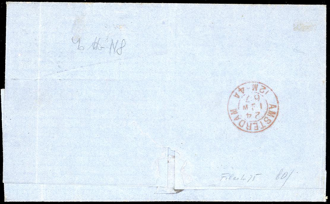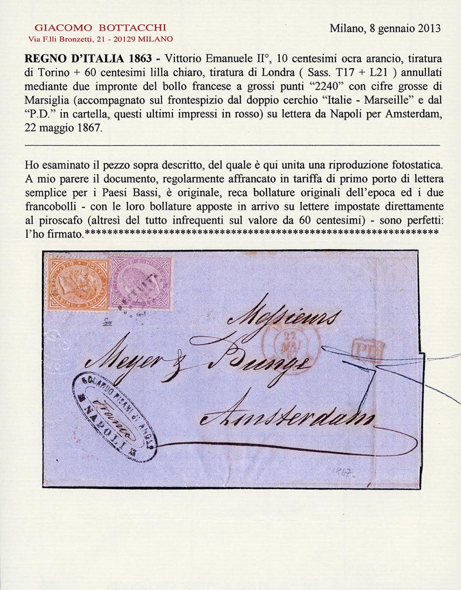 1867 - MARSIGLIA 2240 punti grossi e cifre grandi, punti R1 - 10 cent. e 60 cent. De La Rue, il primo tiratura di Torino, il secondo di Londra (T17,L21), perfetti, su lettera da Napoli 22/5/1867 ad Amsterdam, in Olanda. Rara. Cert. Bottacchi.