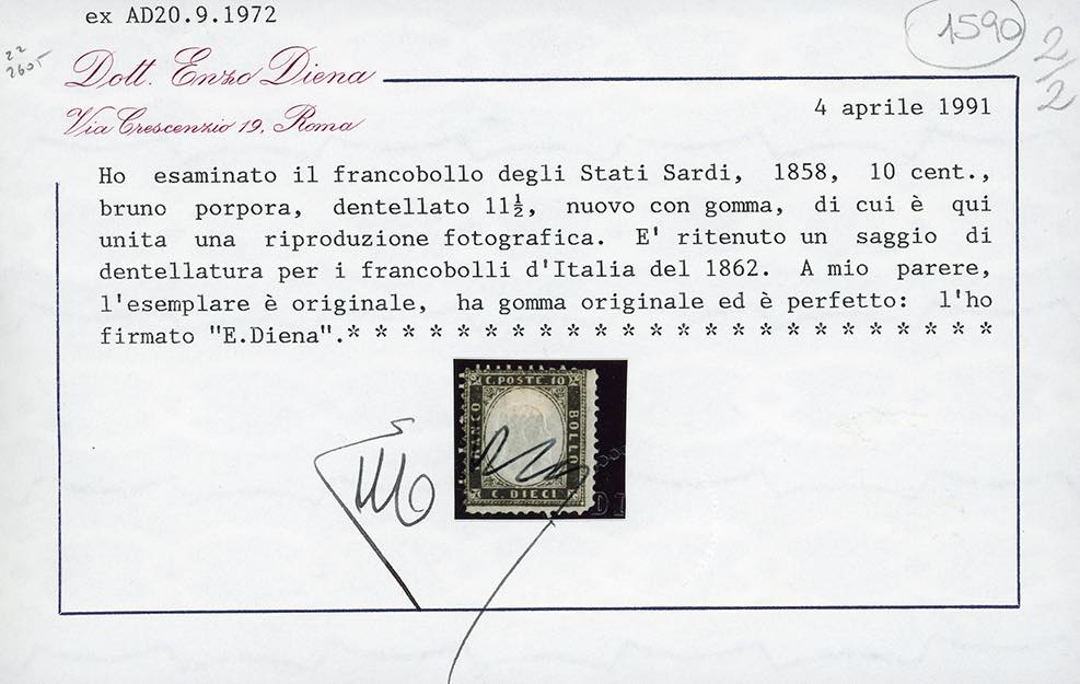 1862 - 10 cent. bruno nerastro, prova di dentellatura lineare 11 1/2 eseguita dalla tipografia Susse di Parigi (1o), nuovo, gomma originale integra, ottimo stato. Cert . E.Diena e Sorani.