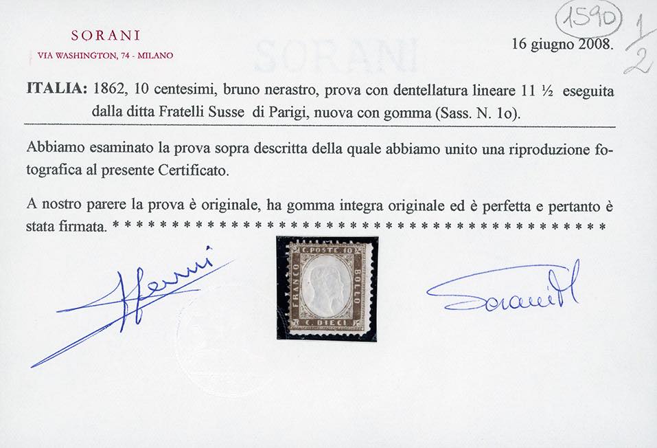 1862 - 10 cent. bruno nerastro, prova di dentellatura lineare 11 1/2 eseguita dalla tipografia Susse di Parigi (1o), nuovo, gomma originale ... Leggi tutto