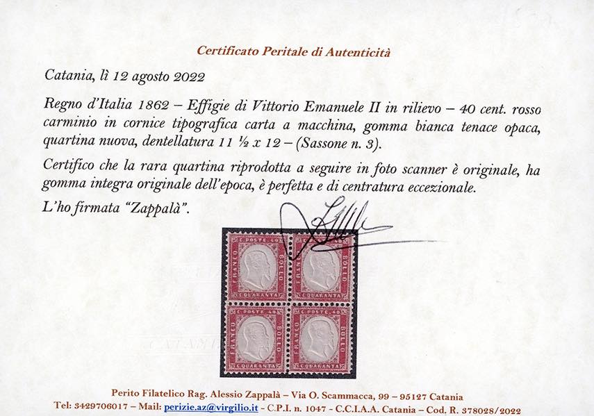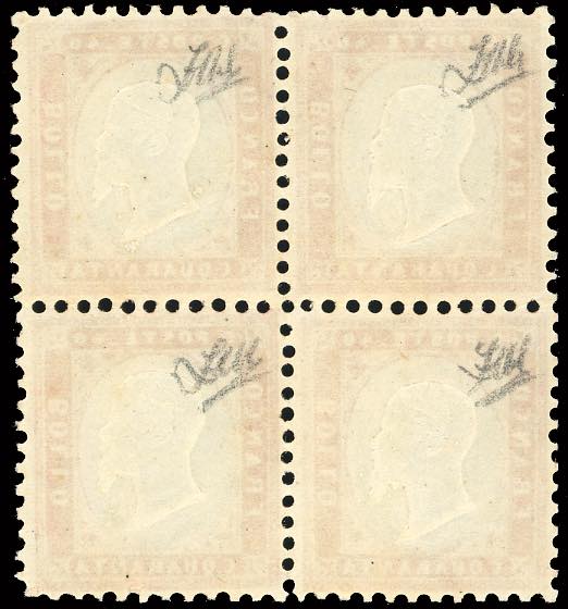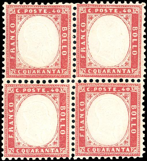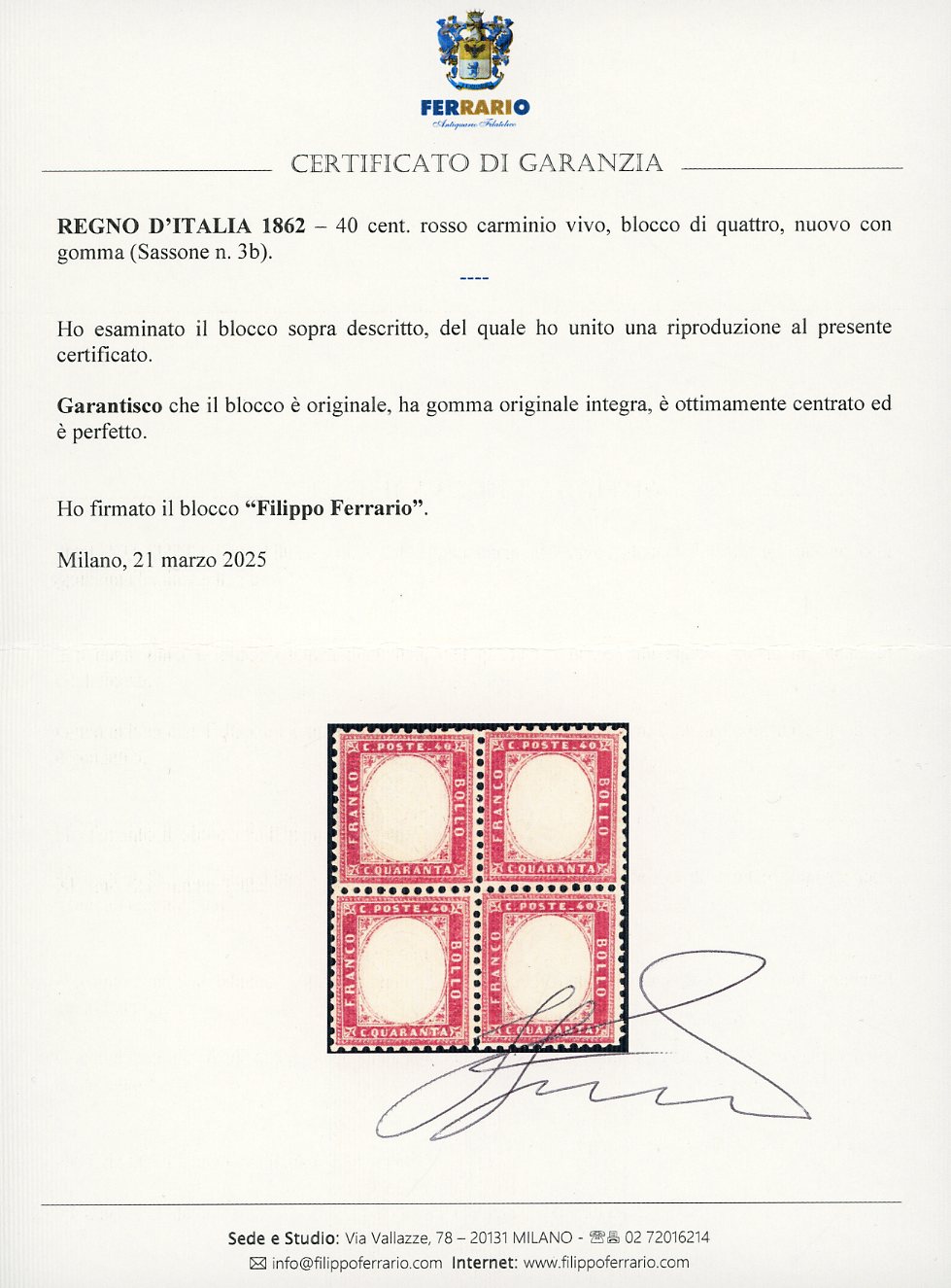 1862 - 40 cent. rosso carminio vivo (3b), ottima centratura, blocco di quattro, nuovo, gomma originale integra, perfetto. Splendido.