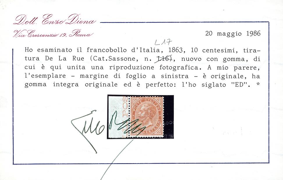 1863 - 10 cent. ocra arancio, De La Rue, tiratura di Londra (L17), bordo di foglio, gomma originale integra, perfetto e molto fresco. G.Oliva, A.Diena, Zanaria, cert. E.Diena e Ferrario.