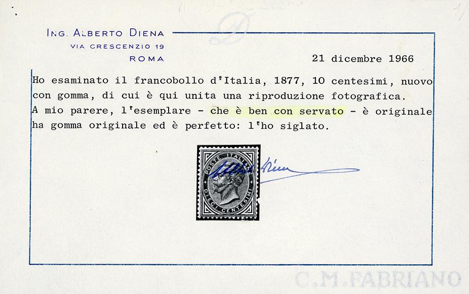 1877 - 10 cent. azzurro (27), ottima centratura, nuovo, gomma originale integra, perfetto. Molto bello, raro in queste condizioni. Em.Diena, cert. A.Diena e Colla.